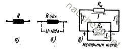 Направленному движению электронов (электрическому току) мешают хаотически двигающиеся молекулы и атомы проводника, что приводит к искривлению пути электронов и уменьшает скорость их передвижения. Следовательно, электрический ток, проходя по проводнику, всегда испытывает со стороны проводника препятствие своему прохождению. Это препятствие называется электрическим сопротивлением проводника и обозначается латинской буквой R. На схемах электрическое сопротивление обозначается так, как показано на рис. 5,а.