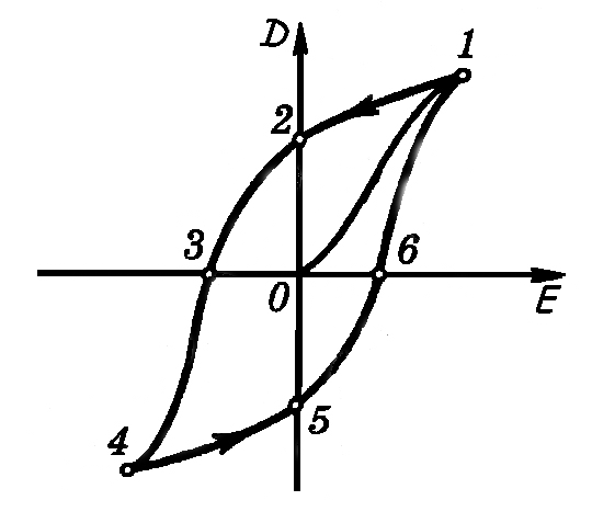При циклическом изменении электрического поля изменение величины электрической индукции определяется петлей гистерезиса 1-2-3-4-5-6-1. Ветви 1-2-3-4 и 4-5-6-1 симметричны относительно точки 0. Поэтому точка 5 эквивалентна точке 2, а точка 6 – точке 3 с поправкой на направление полей