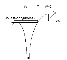 Работа выхода электрона из кристалла.Электронная эмиссия. Электроны, имеющие энергии порядка уровня Ферми, могу переходить на более высокие уровни т.е. переходить в зону проводимости и терять связь с конкретным атомом. В металлах концентрация свободных электронов достаточно велика. Возьмем другую систему отсчёта энергии электронов: внутри вещества энергия отрицательна, вне –положительна. Распределение потенциальной энергии вблизи поверхности кристалла претерпевает «скачок»