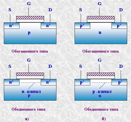 Этому состоянию соответствует знак напряжения на металлическом электроде (затворе), притягивающий основные носители (для n-типа, Vg>0)(рис.а).