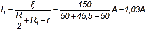 где I1 – сила тока в неразветвленной цепи; R1 –сопротивление параллельно соединенных вольтметра и половины потенциометра.