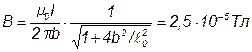 магнитного поля, создаваемого отрезком бесконечно длинного прямого провода, в точке, равноудаленной от концов отрезка и находящегося на расстоянии b = 20 cм от его середины. Сила тока, проходящего по проводу, I = 30 A, длина провода