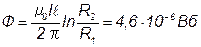 При расчете магнитного потока сквозь площадку S cледует учесть, что согласно условию полем внутри металла (r2 < R2) можно пренебречь. Индукция поля в пределах от R1 до R2 рассчитывается по выражению (3). Вектор положительной нормали к площади S при заданном направлении тока нормален плоскости рисунка и сонаправлен с вектором В, поэтому в выражении