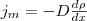где jm — плотность потока массы — величина, определяемая массой вещества, диффундирующего в единицу времени через единичную площадку, перпендикулярную оси х, D — диффузия (коэффициент диффузии), dρ/dx — градиент плотности, который равен скорости изменения плотности на единицу длины х в направлении нормали к этой площадке. Знак минус говорит о том, что перенос массы происходит в направлении убывания плотности (поэтому знаки jm и dρ/dx противоположны). Диффузия D численно равна плотности потока массы при градиенте плотности, равном единице.