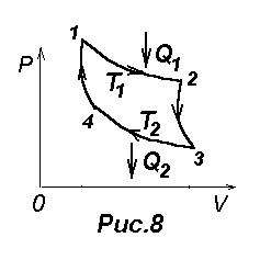 Цикл Карно изображен, где изотермическое расширение и сжатие заданы соответственно кривыми 1-2 и 3-4, адиабатическое расширение и сжатие – кривыми 2-3 и 4-1.