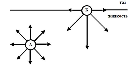 В жидкой фазе важнейшее свойство поверхностного слоя состоит в том, что в нем молекулы обладают избыточной энергией Гиббса по сравнению с молекулами, находящимися в объеме жидкой фазы. Наличие избыточной поверхностной энергии обусловлено не полной компенсацией межмолекулярных сил притяжения (F) у молекул поверхностного слоя (молекула Б) вследствие их слабого взаимодействия с граничной фазой. Силы притяжения, действующие на молекулу А со стороны окружающих ее молекул уравновешивают друг друга, их равнодействующая равно нулю. На молекулу Б со стороны граничных фаз действуют силы разного значения. Так как суммарные силы притяжения единицы объема жидкости много больше, чем суммарные силы притяжения единицы объема газа, равнодействующая сил у молекулы Б направлена вниз перпендикулярно границе раздела фаз. Под влиянием таких некомпенсированных сил находятся все молекулы поверхностного слоя жидкости.