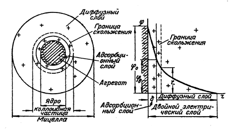 Двойной электрический слой на поверхности коллоидных частиц включает так называемый адсорбционный слой и диффузный слой. Адсорбционный слой образован частью противоионов, которые прочно связаны с ядром мицеллы электростатическими силами (притягивание разноименных зарядов) и адсорбционными силами. Остальные противоионы, благодаря тепловому движению и взаимному отталкиванию, уходят на некоторое расстояние от межфазной границы, образуя диффузный слой ионов, который удерживается у поверхности только электростатическими силами (см. рис.).