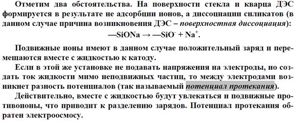 На границе раздела твердой фазы и раствора, как правило, возникает двойной электрический слой (ДЭС). Его происхождение может быть двояким. Во-первых, возможна ионизация молекул, составляющих поверхностный слой твердой фазы, например, ионизация молекул H2SiO3, образующихся на поверхности SiO2 в воде. Во-вторых, на поверхности твердой фазы может происходить адсорбция одного из ионов, присутствующего в растворе электролита. При этом на поверхности преимущественно адсорбируются ионы, входящие в состав твердой фазы или близкие к ним по природе. Так на поверхности частиц золя AgCl будут адсорбироваться ионы Ag+ или Cl– в зависимости от того, какие из них имеются в растворе в избытке. Ионы, определяющие заряд коллоидной частицы (гранулы) называются потенциалобразующими. К заряженной поверхности частиц будут притягиваться ионы противоположного знака, т.е. противоионы, образуя двойной электрический слой.