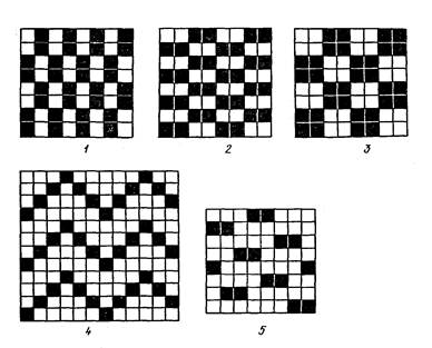 Мелкоузорчатые переплетения построены на видоизменении простых переплетений (репсы, рогожки, сложная комбинированная, ломаная саржа, диагоналевое переплетение, усиленные атлас, сатин) или в результате комбинации простых и видоизмененных переплетений (креповые, комбинированные с рисунком в полоску или в клетку и др.), (рис. 2).