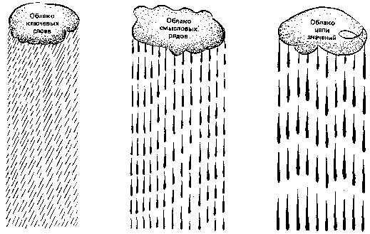 При разработке дифференциального алгоритма мы не предполагали, что может быть дано его зрительное описание. Однако слушатели курсов предложили оригинальное решение зрительного образа алгоритма, что, несомненно, способствует лучшему его пониманию и облегчает его практическое освоение. На рис. 14 алгоритм показан в виде системы облаков. Первые облачка—ключевые слова — разряжаются мелким дождем. Затем они сливаются и образуют облака смысловых рядов, что выражено в крупных каплях, и, наконец, третий образ—туча, которая вмещает в себя все предыдущие облака. Туча значения проливается еще более крупными каплями, а возможно, и градом. Концентрируется смысловая энергия—доминанта текста. На рис. 15 показан еще одни пример зрительного представления алгоритма, который не требует пояснения. Мы рекомендуем вам придумать и изготовить подобные рисунки самостоятельно.