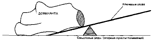 Доминанта — главная смысловая часть текста. Она выражается своими словами, на языке собственных мыслей, является результатом переработки текста, его осмысления в соответствии с индивидуальными особенностями читателя, выявления основного замысла автора. Таким образом, в тексте встречаются слова, которые как бы «подталкивают» вас читать дальше, дальше, предупреждают, что изменений смысла не предвидится. Бывают другие слова, которые «предупреждают» об изменении, «повороте» смысла, «говорят» вам, чтобы вы замедлили скорость чтения, что впереди «крутой поворот». Очень важно знать, как пользоваться такими словами-сигналами.
