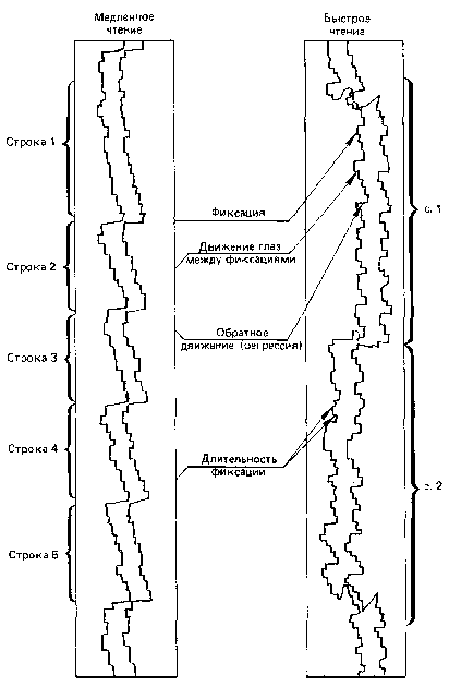 Анализируя эти и другие записи, можно заметить, что каждая вертикальная линия представляет собой фиксацию глаз в процессе чтения, во время которой и происходит непосредственное восприятие информации. Горизонтальные линии — это движения глаз между фиксациями, непродолжительные по времени. В левом фрагменте глаза движутся по строкам текста и проходят каждую из них за 10—15 фиксаций, затем взгляд возвращается к началу следующей строчки. И так повторяется 5 раз.