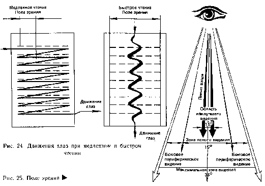 Очевидно, данным требованиям будет удовлетворять такая техника чтения, при которой глаза читающего двигаются вертикально сверху вниз по воображаемой линии, проведенной по центру страницы, с небольшими колебаниями вправо и влево. При традиционном медленном чтении глаза двигаются равномерно по строкам страницы слева направо и по окончании каждой строчки вновь возвращаются к началу следующей. При быстром чтении движение глаз более экономно, поскольку глаза проходят всю страницу текста по кратчайшему пути—прямой линии (рис. 24).