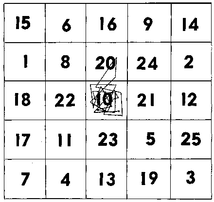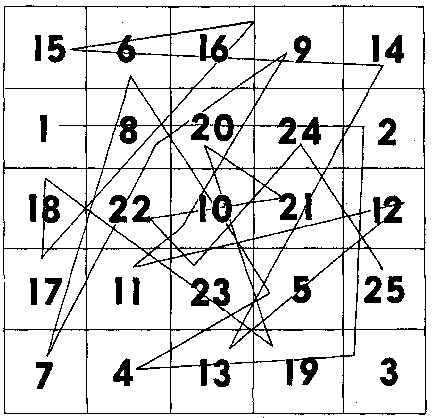 Нам удалось найти специальный методический инструмент и разработать упражнения, которые значительно расширяют поле ясного видения и решают задачу вертикального движения глаз по центру страницы при чтении. Таким инструментом оказались широко известные у психологов тестовые цифровые таблицы Шульте. На вкладыше, приложенном к книге, размещено 8 таблиц Шульте. При работе с ними надо, концентрируя взгляд в центре очередной таблицы, видеть ее всю целиком и найти все видимые цифры по порядку нарастания счета за время не более 25 сек. Таблицы Шульте обычно применяются для исследования и развития психического темпа восприятия, в частности скорости зрительных ориентировочно-поисковых движений. Каждая таблица представляет собой разграфленный на 25 ячеек квадрат размером 20Х20 см со вписанными в ячейки в беспорядке числами от 1 до 25. Вам необходимо использовать все 8 таблиц или изготовить их самим по образцу (рис. 26). Время, затраченное на поиск всего ряда чисел в каждой таблице, замеряется по секундомеру.