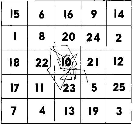 Рис. 27 демонстрирует более совершенную технику поиска цифр. Обучающийся стремится удерживать взгляд в центральном поле таблицы, фиксируя боковым зрением все остальные цифры. Это пример эффективной тренировки, обеспечивающей расширение поля зрения. Время работы с таблицами в этом случае составляет 15—20 сек. И наконец, на рис. 28—пример поиска цифр обучающимся, достигшим совершенства в работе с таблицами Шульте. Взгляд фактически неподвижно фиксирует центральную часть таблицы. Время поиска всех цифр 8—11 сек.