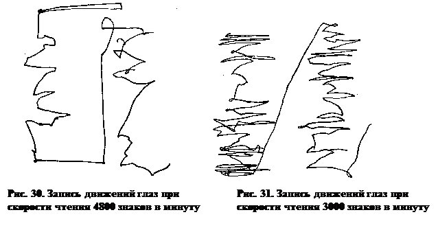 Рассмотрим экспериментальные записи движений глаз. На рис. 30 дана запись движений глаз по тексту заметки газеты «Правда» испытуемой С.. прошедшей обучение за три месяца до этого исследования. Она прочла статью в пять абзацев за 20 сек., показав при этом скорость чтения 4800 знаков в минуту.