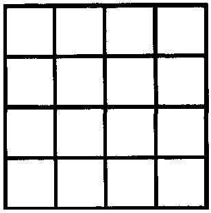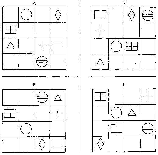 Нарисуйте четыре квадрата по форме, указанной на рис. 37. Это будет наша рабочая матрица 4Х4. Обозначьте их соответственно «А», «Б», «В», «Г». Далее вы найдете такие же квадраты с вписанными фигурами. Посмотрите внимательно в течение 30 сек. на фигуры квадрата «А» (рис. 38), постарайтесь запомнить сами фигуры и их расположение. После этого воспроизведите фигуры квадрата «А» на подготовленном вами бланке. Точно так же поступайте с квадратами «Б», «В», «Г».