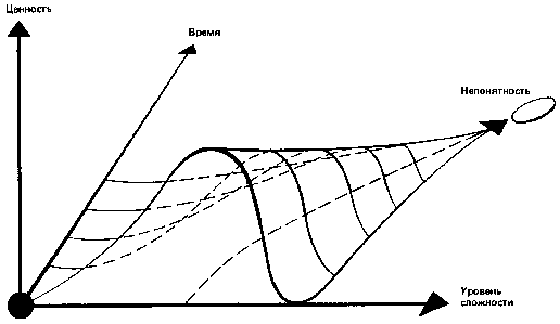 Как показано на графике, произведение искусства представляет собой сообщение, характеризуемое степенью сложности или количеством информации, причем эта характеристика, в свою очередь, зависит от культуры данного общества. Как показано на графике, ценность произведения меняется в зависимости от его сложности, следуя кривой, имеющей в какой-то точке максимум. Этот максимум в процессе исторического развития общества и роста его культуры смещается. В то же время он становится размытым в результате более равномерного распространения элементов культуры. Иначе говоря, общая эволюция искусства приводит к появлению все более уточненных и труднопонимаемых сочетаний элементов, т. е. того, что в каждую эпоху называют непонятным. Как здесь не согласиться со знаменитым высказыванием Гете: