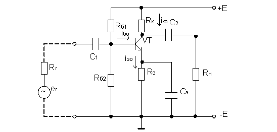 Rэ – эмиттерное сопротивление, обеспечивающее последовательную ООС по току и стабилизацию режима работы (усилитель ОЭ с эмиттерной стабилизацией);