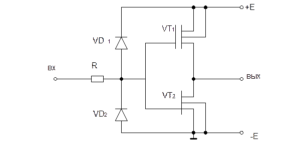 Если Uвх > Епит или Uвх < 0, то либо VD1, либо VD2 открываются и лишний ток и напряжение уходят в шины питания.