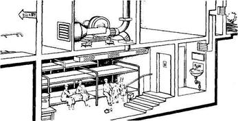 На рис. 12 представлен пример противорадиационного укрытия, в котором предусматривают основные (используемые для укрываемых) и вспомогательные (используемые для систем жизнеобеспечения – освещение, вентиляционной установки, водоснабжение, отопление, санитарные узлы и т.д.) помещения.