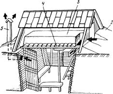| 1 – приточное отверстие вентиляции; 2, 3 – слой земли; 4 – усиливающие рамы; 5 – вытяжное отверстие вентиляции. |