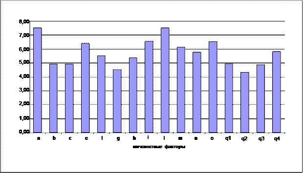 Нами обнаружено, что средние показатели личностных факторов находящиеся выше 7 стенов соответствуют факторам «А – замкнутость-общительность» и «L – доверчивость-подозрительность»; больше 6 - факторам «E – подчиненность – доминантность»; «I – жесткость – чувствительность»; «M – практичность – мечтательность»; «O – спокойствие – тревожность» - т.е. эти показатели слегка отклоняются от среднеквадратичного значения.