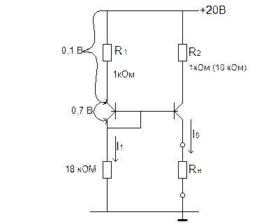 Параметры источника тока можно улучшить, если ввести ООС по току, т. к. ООС по току увеличивает Rвых Þ и увеличивается эквивалентное сопротивление источника тока. В рассматриваемой схеме это обеспечивается с помощью R2. Величина резистора берется такой, чтобы падение напряжения на нем было не очень большим ~ 0,1¸0,7 В, при этом потери напряжения на нем небольшие, а ООС сохраняется во всем диапазоне (практически) питающего напряжения. При этом, чтобы I0 = I1обходимо исполнение R1 = R2. В этом случае ток задания I0 = I1. Если выбрать R1 ¹ R2, то можно маштабировать токи I0 и I1.