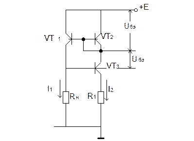 Таким образом потенциал коллектора VT1 фиксируется с помощью VT3 на уровне 2 Uбэ0 ниже, чем напряжение питания и при всех изменениях Rн и питающего напряжения практически остается постоянным, поэтому эффект Эрме для VT1 устраняется, что обеспечивает I1 = const во всем рабочем диапазоне (Е - 2 Uбэ0).
