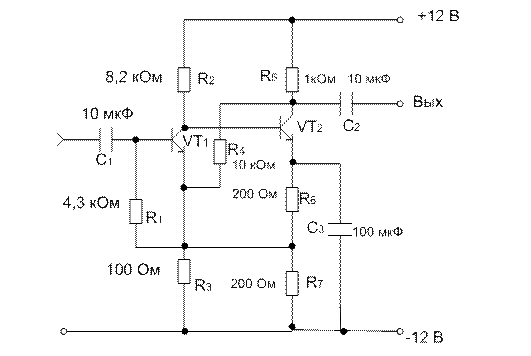 Используются однотипные транзисторы. По такой структуре усилитель выпускается в виде интегральной схеме и внешними элементами являются С1, С2, С3.