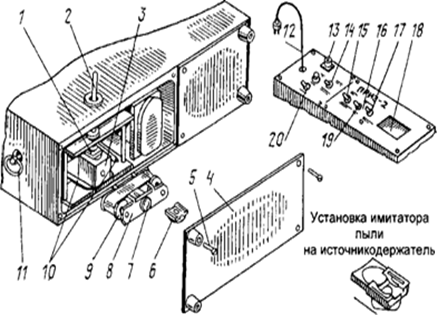 1 – источникодержателъ; 2 – воздухозаборный патрубок; 3 – узел счетчика; 4 – крышка блока регистрации; 5 – винт; 6 – имитатор пыли; 7 – винт; 8 – кассета с фильтрующей лентой; 9 – катушка; 10 – направляющие; 11 – шток; 12 – шнур питания; 13 – разъем для подключения к бортовой сети; 14 – тумблер «Работа-заряд»; 15 – тумблер «Вкл.» блока питания; 16 – светодиод контроля правильности работы «Сбой»; 17 – кнопка «Сбой»; 18 – табло индикации; 19 – тумблер «Работа-контроль»; 20 – тумблер «Вкл.» блока регистрации