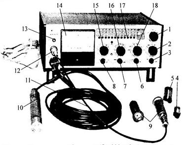 1 – переключатель рода работ; 2 – переключатель ФЛТ режимов работы; 3 – кнопка СВ, ДНФ-измерений в режиме свободного или диффузного поля; 4 – вибродатчик ДН-4; 5 – вибродатчик ДН-3; 6 – кнопка диапазонов октавных фильтров; 7 – кнопка включения ФНЧ10 кГц или 4 кГц; 8 – кнопка включения в режим измерения виброускорения или виброскорости; 9 – эквивалент капсюля микрофонного (вибропреобразователя); 10 – предусилитель ВПМ-101; 11 – кабель подключения к калибровочному генератору; 12 – гнездо калибровочного генератора; 13 – регулировочный резистор калибровки; 14 – измерительный прибор; 15 – переключатель ДЛТ-1 выбора предела измерения; 16 – переключатель ДЛТ-2 выбора предела измерения; 17 – индикаторы пределов измерений (светодиоды); 18 – переключатель октавных фильтров