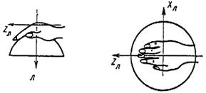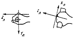 - локальную вибрацию подразделяют на действующую вдоль осей ортогональной системы координат XЛ, YЛ, ZЛ (рисунок 8.1), где ось XЛ параллельна оси места охвата источника вибрации (рукоятки, ложемента, рулевого колеса, рычага управления, удерживаемого в руках обрабатываемого изделия и т.п.), ось YЛ перпендикулярна ладони, а ось ZЛ лежит в плоскости, образованной осью XЛ и направлением подачи или приложения силы (или осью предплечья, когда сила не прикладывается);
