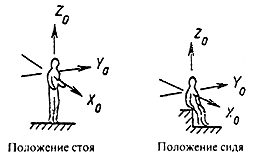 - общую вибрацию подразделяют на действующую вдоль осей ортогональной системы координат XО, YО, ZО (рисунок 8.2), где XО (от спины к груди) и YО (от правого плеча к левому) - горизонтальные оси, направленные параллельно опорным поверхностям; ZО - вертикальная ось, перпендикулярная опорным поверхностям тела в местах его контакта с сиденьем, полом и т.п. [22]/