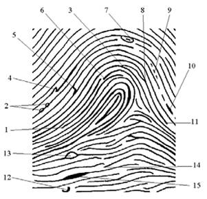 Рис. 8. Частные признаки папиллярных узоров: 1 - начало линии; 2 - поры; 3 - разветвление линий; 4 - изгиб; 5 - мостик; 6 - встречная линия; 7 - глазок; 8 - слияние линий; 9 - межпапиллярные линии (гребешки); 10 - короткая линия; 11 - окончание линии; 12 - крючок; 13 - островок; 14 - обрыв линии; 15 - утолщение линии.