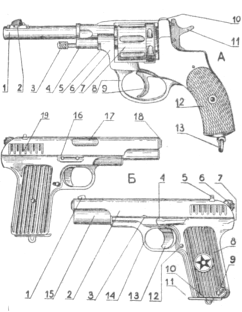 Б. Пистолет образца 1933 г. («TT»): 1 — мушка; 2 — кожух-затвор; 3 — вырез для выступа затворной задержки; 4 — затворная задержка; 5 — целик; 6 — курок; 7 — рамка; 8 — рукоятка с щечками; 9 — ушко рукоятки; 10 — ушко крышки магазина; 11 — крышка магазина; 12 — кнопка защелки магазина; 13 — спусковой крючок; 14 — спусковая скоба; 15 — трубка кожуха затвора; 16 — пружина затворной задержки; 17 — окно для выбрасывания стреляных гильз; 18 — направляющая втулка; 19 — насечка для отведения кожуха-затвора.