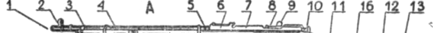 А. Револьвер системы Нагана образца 1895 г.: 1 — ствол; 2 — мушка; 3 — шомпол; 4 — шомпольная трубка; 5 — ось барабана; 6 — рамка; 7 — барабан; 8 — спусковая скоба; 9 — спусковой крючок; 10 — целик; 11 — курок; 12 — рукоятка с щечками; 13 — кольцо.