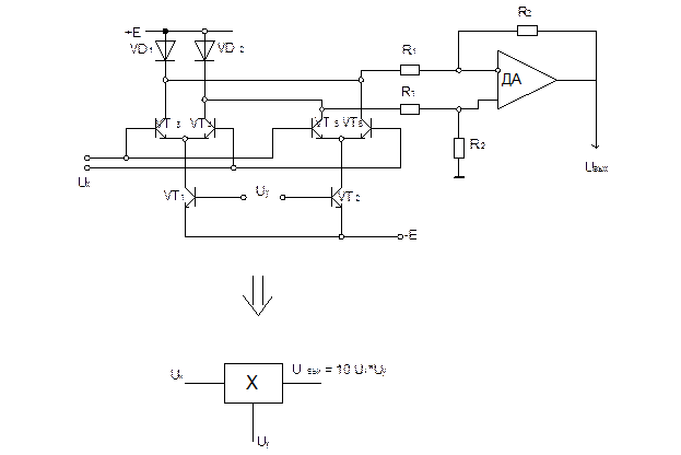 С помощью диодов VD1, VD2 выполняется операция антилогарифмирования, за счет чего достигается расширение диапазонов входных сигналов. С помощью ДУ на ОУ сигнал с VD1, VD2 выделяется, усиливается и преобразуется к однополярному выходу. В результате симметричности схемы обеспечивается 4-х квадрантное умножение и при согласованных транзисторах приемлемая точность умножения (d<1%). Если d<0,1%, то это инструментальные умножители. Каскад без диодов и ОУ выпускается в виде самостоятельного изделия как схема балансного умножителя, смесителя для преобразования (частотного) сигналов. Например: