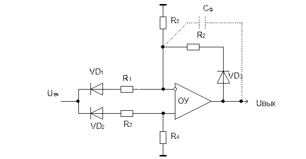 Диод VD3 в данной схеме выполняет функции компенсации нелинейности входного сопротивления диодов VD1 и VD2 при малых Uвх. Все диоды VD1 - VD3должны быть согласованы, чтобы не было погрешности при выпрямлении.