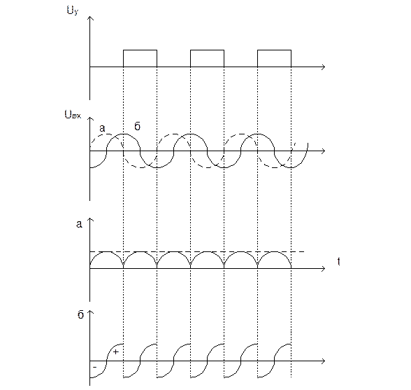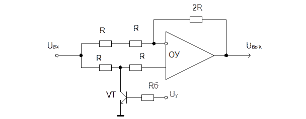 Используется дифференциальное включение ОУ; VT выполняет роль ключа. Если Uy > Uвкл (0,7 В), то VT включен, насыщен и его Uкэ @ 0, т. е. НИ вход соединен с землей через резистор R и усилитель инвертирующий и