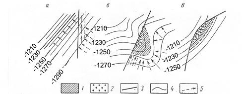 а – залежи не образуются; б, в – образование залежей возможно; 1– нефть; 2 – газ; 3 – линии экранов; 4 – изогипсы пласта; 5 – направление миграции.