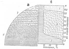 Рис. 15. Схематический разрез обычного нефтяного пласта с относительным распределением газа, нефти и воды (по А.И. Леворсену): а – поперечный разрез структуры; б – насыщение пористой среды жидкостями; 1 – газ; 2 – нефть (среднее содержание 80% нефти и 20% воды); 3 – нефть; 4 – вода (100%); 5 – вода; 6 – переходная зона от нефти к воде; 7 – переходная зона от газа к нефти.