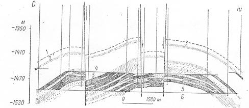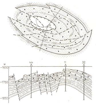 Рис.23. Пластово-сводовая тектонически экранированная залежь. Глинско-Розбышевское месторождение Днепровско - Припятская газонефтеносная провинция (по П.Т. Павленко, Л. С. Палец).