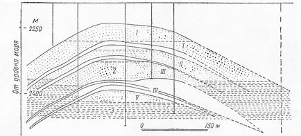 Несмотря на всю сложность геологического строения, водонефтяной раздел располагается на одинаковой гипсометрической отметке – 1500 м. Газонефтяной раздел находится в пределах 1485 – 1488 м, изредка доходя до 1480,5 м ниже уровня моря. Равномерность глубины залегания этих разделов жидкостей указывает, что между всеми песчаниками существует гидродинамическая связь. На рис.17 приведен разрез по структуре месторождения Тен-Секшн, Калифорния, из которой видно, что каждый из пяти пластов песчаника, приуроченных к зоне Стивенс (миоцен), представляет собой изолированный нефтяной пласт, не сообщающийся с другими. В каждом песчанике имеется свой водонефтяной контакт; из этих песчаных пластов три имели первоначально газонефтяные контакты. Каждый из этих пластов имел шапку свободного газа в приподнятой части складки.