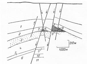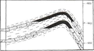 Водонефтяной контакт находится на одном и том же уровне во всех сбросовых блоках, на которые разбита основная структура, представляющая собой куполообразное поднятие, перекрывающее глубоко залегающий соляной сток. Когда была вскрыта залежь, то в нижнем блоке, обозначенном на рисунке буквой А, оказалась шапка свободного газа. Это приводит к мысли, что аккумуляция нефти и газа произошла до процесса сбросообразования. При этом наивысшая часть ловушки (блок А) была сброшена относительно остальной части купола. Гидравлическая связь, существующая внутри нефтяной зоны между различными сбросовыми блоками, дала возможность установиться водонефтяному зеркалу на общем уровне по всей залежи. В то же самое время газонефтяной контакт в нижнем сбросовом блоке был защищен покрышкой, запечатанной подстилающей нефтью, и поэтому остался нетронутым.