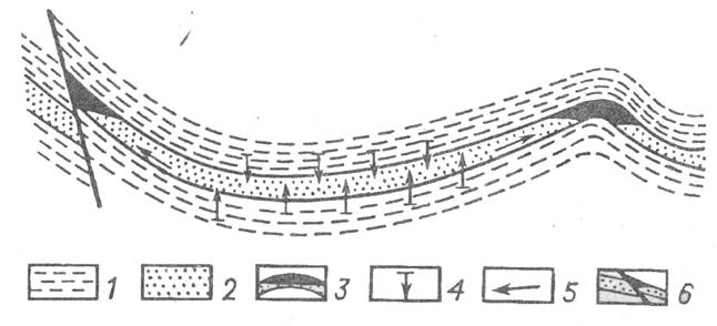 1 – глинистые породы, 2 – коллектор, 3 – залежь нефти; направление миграции углеводородов: 4 – первичной, 5 – вторичной,