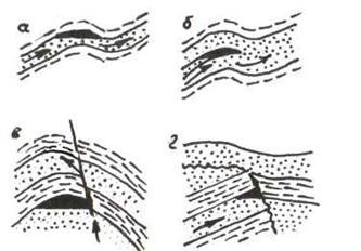 Рис.28. Внутрирезервуарная (а,б) и межрезервуарная (в, г) миграция (стрелка показывает направление миграции).