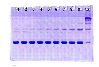 Рис.. Электрофореграмма РБ в SDS-ПААГ. Дорожки 1-9 – фракции гибридного белка, полученные в процессе очистки на DEАE-сефарозе FF, дорожка 10 – калибровочные белки