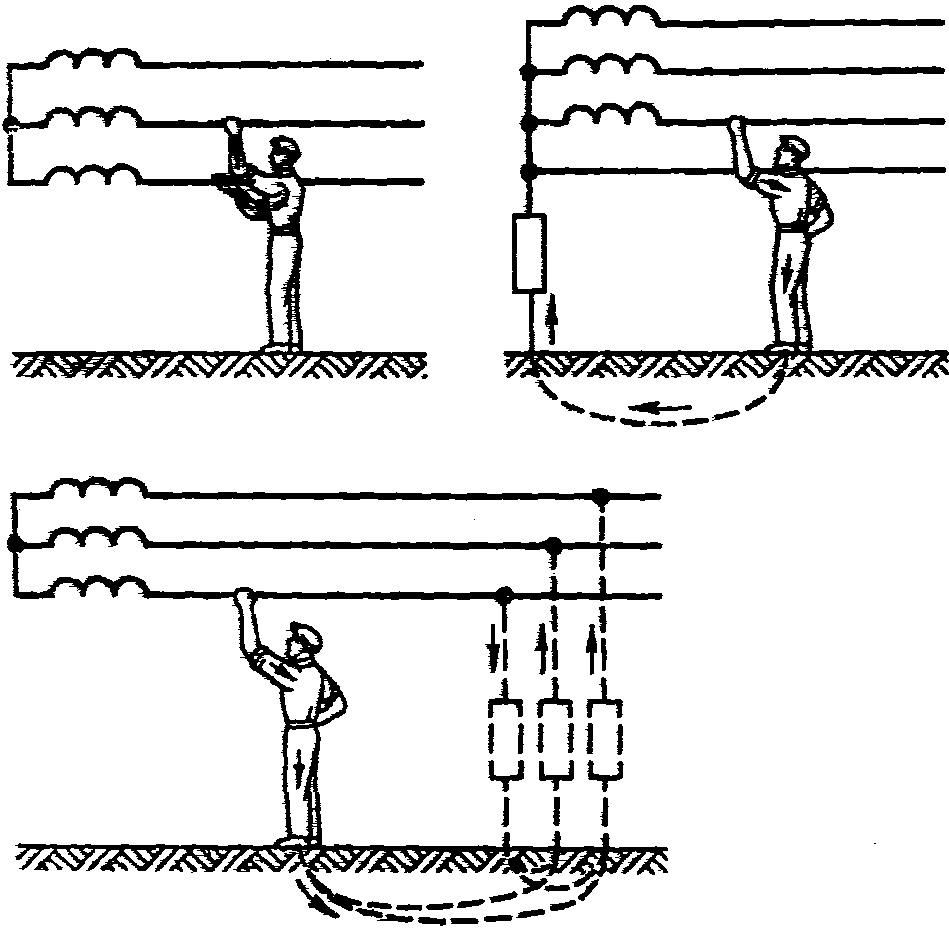 Приведенные примерыпоказывают, какое исключительное значение для безопасности работающего с электроустановками имеют изолирующие полы и обувь, а в сети с изолирующей нейтралью также и сопротивление изоляции проводов относительно земли.