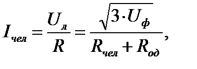 При двухфазном включении (см. рис. 8.2 а) величина тока, протекающего через тело человека, будет равна